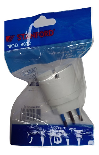 Adaptador de enchufe fabricado en termoplástico de alta resistencia (Anti-llama). Producto diseñado para adaptarse a enchufes macho de tipo Schuko STANFORD, muy comunes en la fabricación de aparatos electrodomésticos (Hervidores, Hornos eléctricos, Microondas, etc.) y de línea blanca (Lavadoras, Secadoras, etc.) Contactos de bronce niquelado con aislación y alvéolos protegidos (protección para niños). Cuenta con 2 polos más tierra. 10A – 250V ( Máx. 1500W ) y es un producto certificado según normas SEC (Chile).